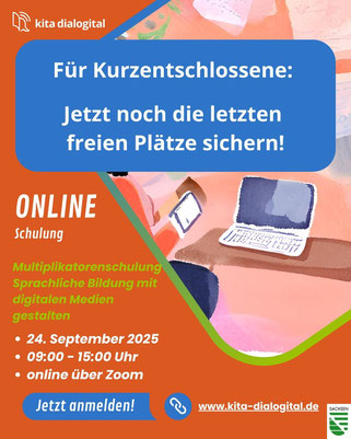 Am 24.09.2025 findet von 9.00 bis 15.00 Uhr unsere Multiplikatorenschulung statt und Kurzentschlossene können sich noch anmelden! Sichern Sie sich die letzten freien Plätze und erfahren Sie, wie Sie sprachliche Bildung mit Medien gestalten und mit Ihrem Team thematisieren können.